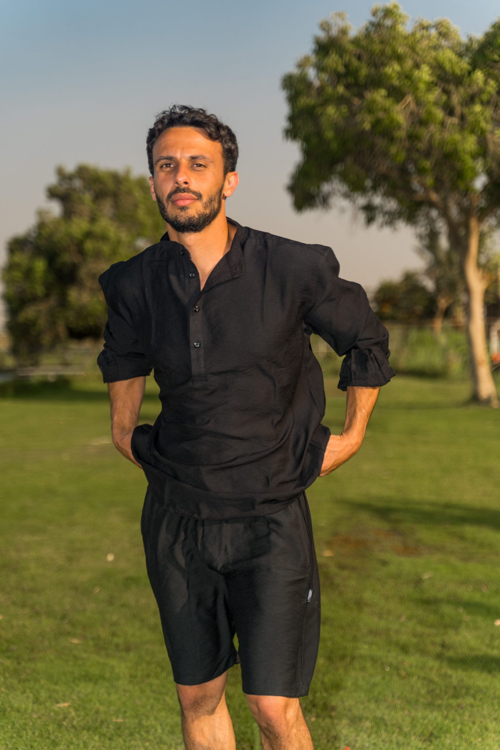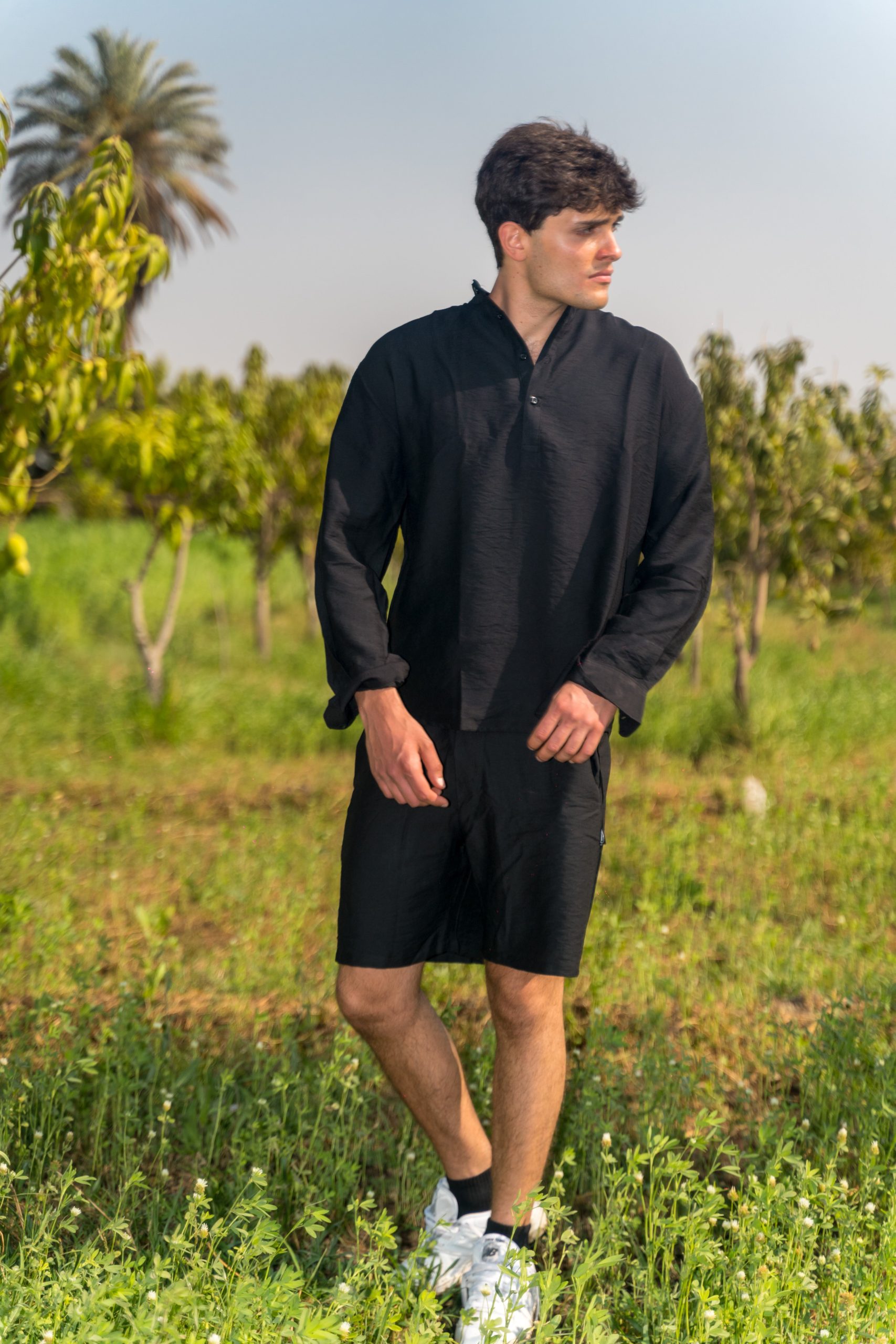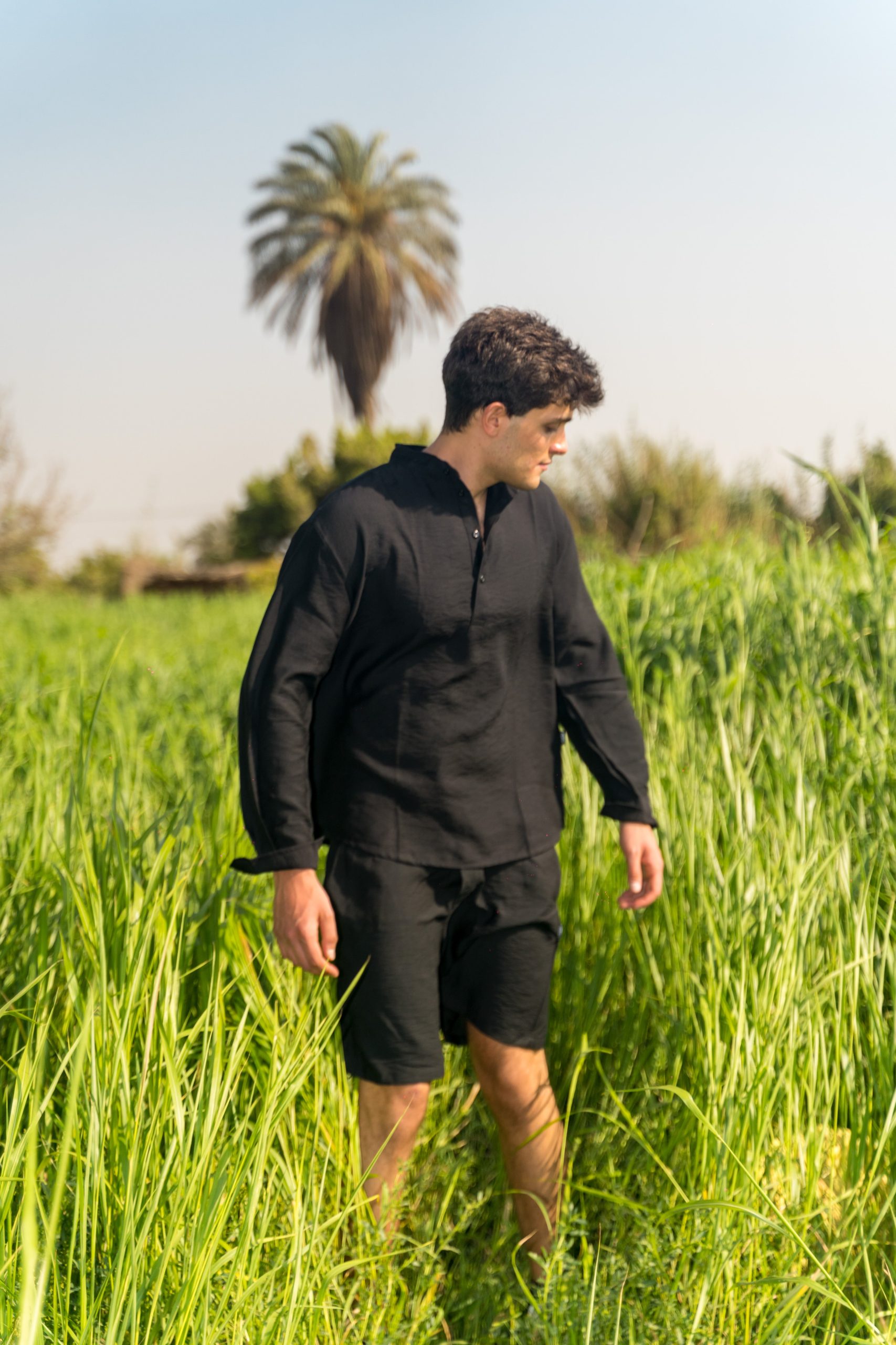Crafted from a premium, breathable linen blend, this two-piece set features a 3-button relaxed-fit shirt and slightly elongated shorts, offering a balance of laid-back ease and tailored presence. The Black colorway grounds the set in soft neutrality — light, classic, and endlessly versatile for summer days and coastal nights.